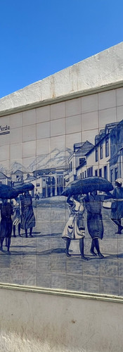 We stopped at the African market where the colors of the fabrics were as bright as the fruit in the market. Scattered along the walls were incredible blue and white tiled illustrations of the history of Cape Verde. Long docks that were badly made and where workers would have to carry the fish and coal to ships on their backs replaced with sturdy docks, dolly systems and iron crabs replaced when the British arrived. Images of slaves from Goa brought to become household help were on another tile. In just 4 or 5 images you saw the history of this very small island known for fish and coal.