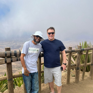 On long long man made cobble stone roads where we passed many a hiker- we went up and up and midway to the top he stopped at the “Tea Shop”. A shack off the side of the road where a man grew tea. And I’m not talking some big tea field- I’m talking like what you might grow in your backyard. Again the biggest issue - WATER. He showed us this incredible system for catching water. A mesh net across a wooden wall catches the “mist” from the fog and then it takes the moisture from the net and drops it into an underground barrel that holds the water. Ingenious at best! We each had a cup of tea which was delicious and it was incredible how we went from a hot hot day to suddenly it was both freezing and so misty. Paolo giving his “2 cents” to the owner’s granddaughters who weren’t in school and learning English!